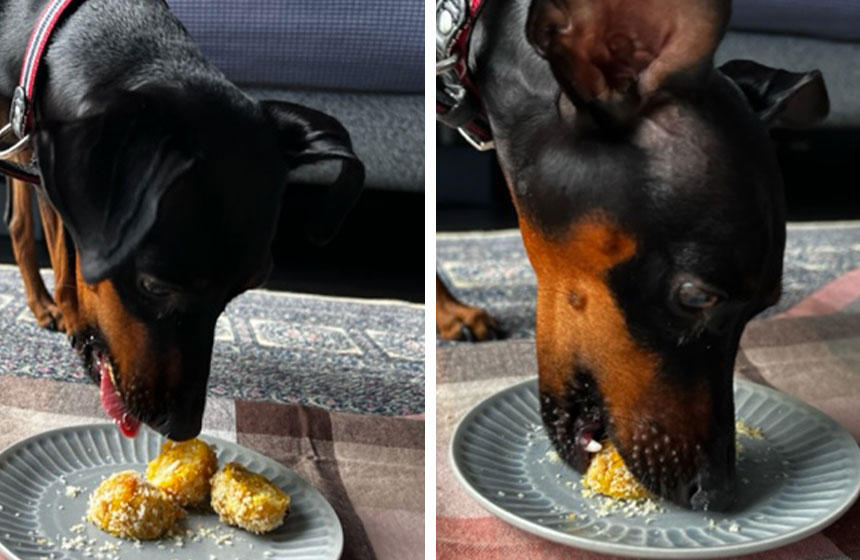 パン粉をつかった揚げ物風ごはんは初めてのうちの子。食べやすいように半分にカットしていただきます。サクサクの食感に大好きなささみがはいっていてびっくりしている様子。大きく口を空けて、ペロッと完食!いつもと違ったごはんに喜んでくれました。次はお肉の種類を変えてつくってみようかな。御馳走様でした。