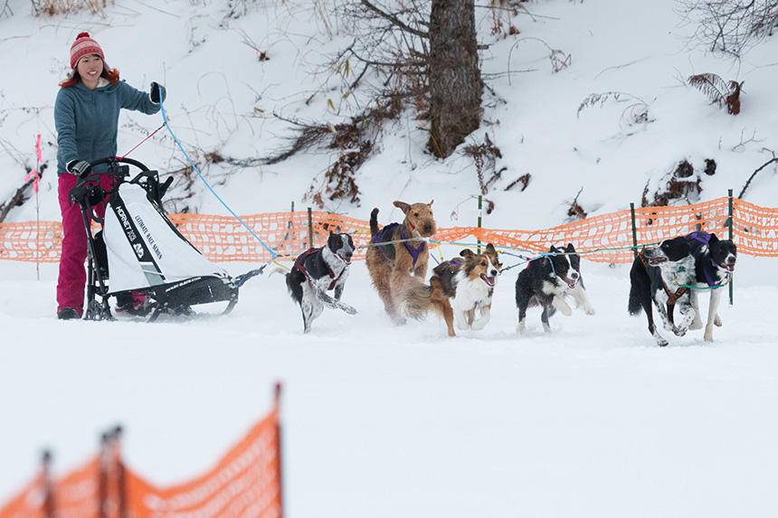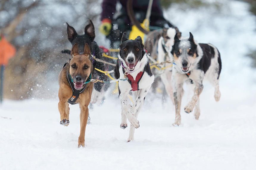 そり犬の頭数は1頭から多くて6頭程度。もちろんハスキーもいたが、犬種は実にさまざま。大型犬よりもむしろボーダーコリー、セッター、ポインターなどの系統の中型犬が多く、日本犬や小型犬の姿もあった。飼い主さんが前を走って誘導してはじめて走り出すようなビギナーの参加も歓迎。皆で力を合わせて楽しむことに重点を置いているのが、犬と人の目の輝きを見て感じ取れた。