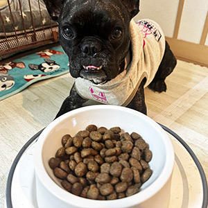 トッピング推奨のフードなので最初はレトルトやお肉やお魚をトッピングしていましたが、ワイルドサーモンのフードはカラカラと器に出す音がしただけではハウスでお座りして待つくらい大好きみたいなので、重点を置いている朝食は生肉やレトルトを日替わりでトッピングし、夜はトッピングはせずその分フードの量を増やして食べさせています。♪