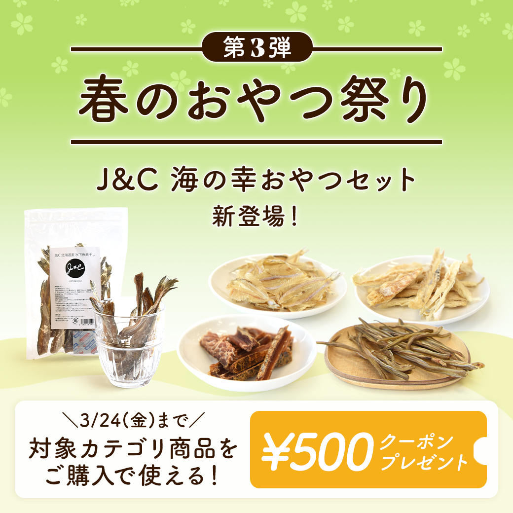 今回で第3回目となる「春のおやつ祭り」は、J&Cのお魚おやつが5種類入った「海の幸おやつセット」と、ジャーキーカテゴリで使えるお得なクーポンのご紹介。