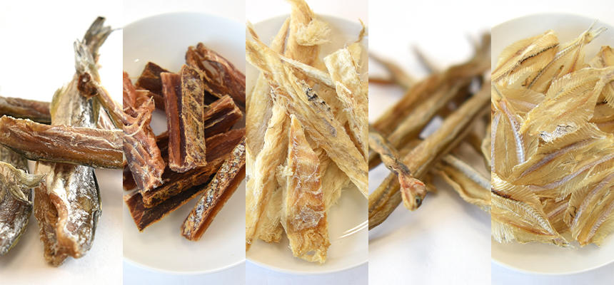 お魚オヤツが豊富に揃うJ&Cから、人気の氷下魚(コマイ)、アナゴ、イワシ、鮭、鱈の5種のオヤツをセレクト。色んなお魚が楽しめます。