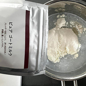 1.鍋にPOCHIピュアゴートミルク、粉寒天、水を入れ混ぜながら中火で煮立たせて、火を止める。ボウルを3つ用意し、3等分に分けておく。