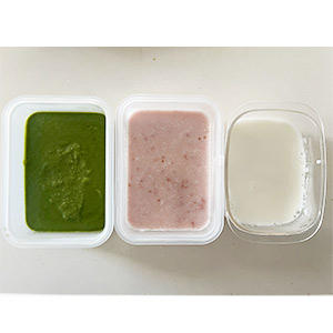ベースの味付けは、大好きな子が多いPOCHIのピュアゴートミルクを使い、桃色はいちご、緑はほうれん草を混ぜて仕上げました。