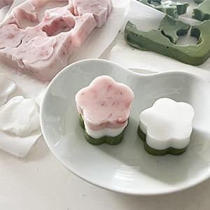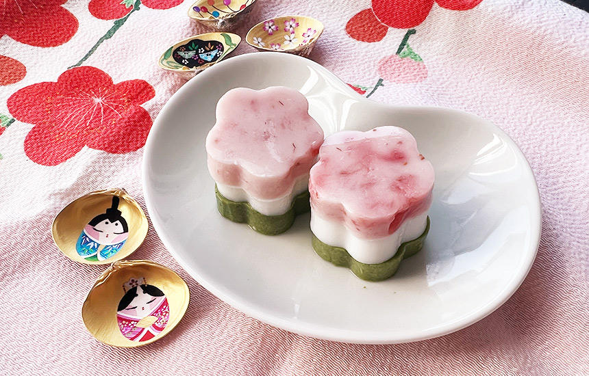 春らしく梅で型抜きしましたが、菱餅のようにひし形にしたり、ハート型にして可愛くしてみたりお好きな形で楽しんでみても。