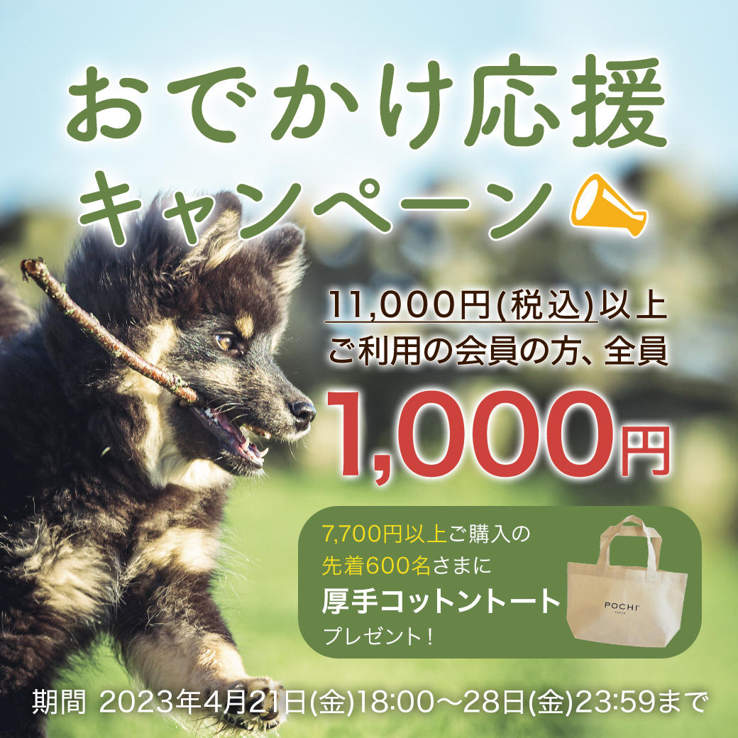 ゴールデンウィークの休日に、犬たちと一緒に思いっきりたのしんでいただくために「おでかけ応援Wキャンペーン」として、 1,000円クーポンとPOCHIオリジナルトートプレゼントのWキャンペーンを開催。