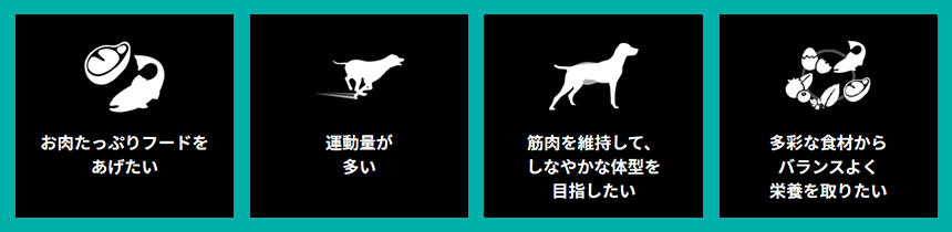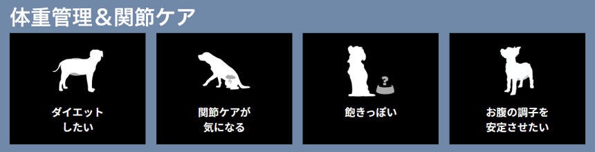 「ダイエットがしたい」「皮膚被毛を綺麗にしてあげたい」「引き締まった体型にしたい」など、これまでのラインナップが目的別にわかりやすくなり、新しく2商品が加わって、内容量も変更になっています。