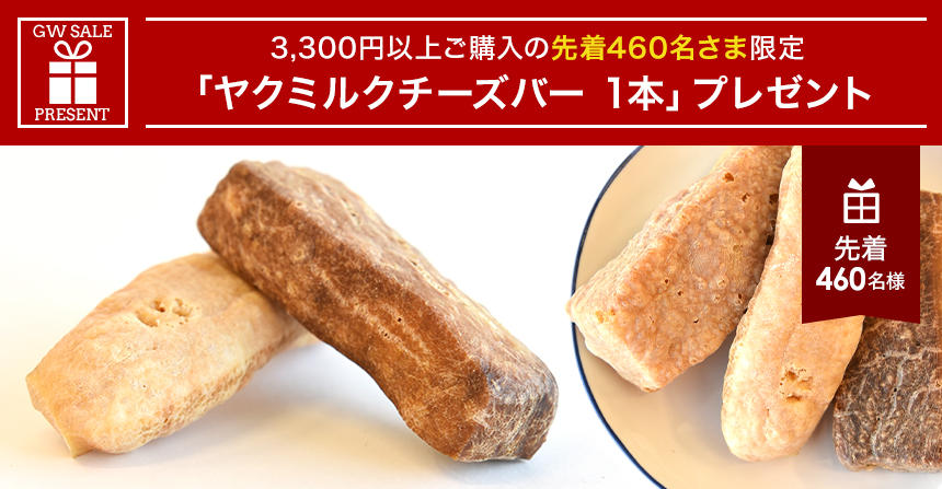 昔ながらの製法で作ったナチュラルチーズのおやつ「ヤクミルクチーズバー」を、先着460名さまにプレゼントとしてご用意しました。