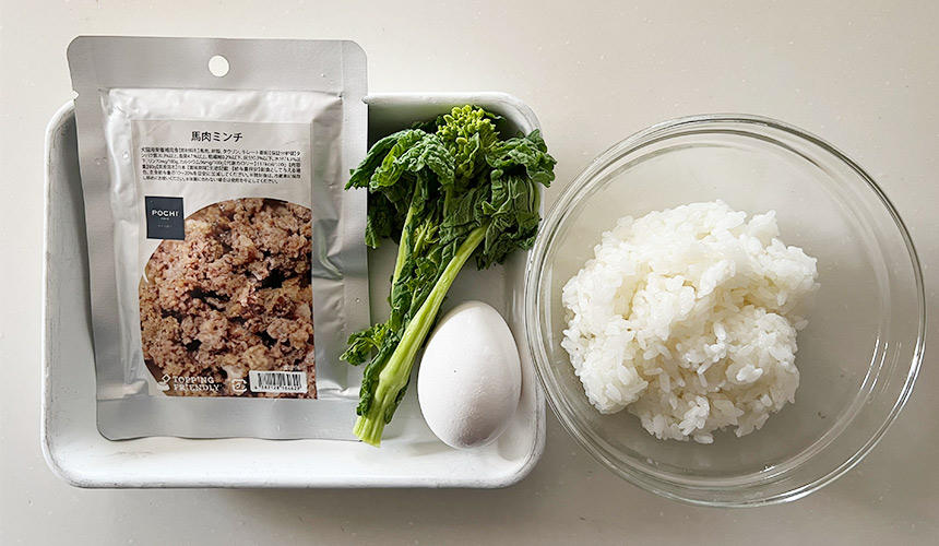 馬肉はさくら肉と呼ばれることから春を感じさせる食材。今回使用するのは具のみですが、残った汁はドライフードなどいつものごはんにかけてもおいしくいただけます。