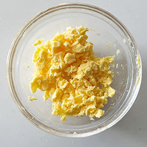 1.深めの耐熱ボウルに卵を入れ混ぜ、ラップをかけ500wで50秒加熱する。フォークなどを使ってそぼろ状にしておく。