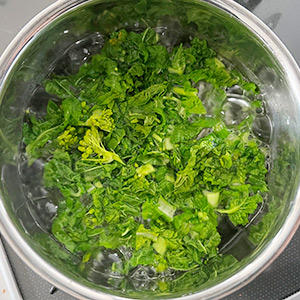 2.菜の花を1cmくらいの大きさにカットし、沸騰したお湯で1分ほどゆでる。冷水で冷やしたら、手でぎゅっと絞ってしっかり水を切っておく。