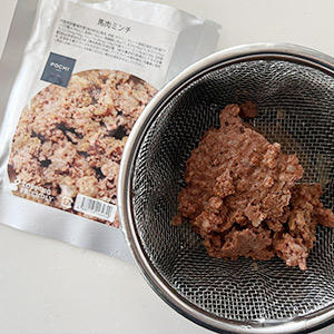3.POCHI 馬肉ミンチを汁と具に分けておく。