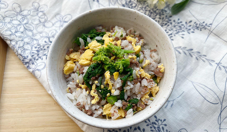 今回ご紹介したのはトッピングレトルトをごはんと混ぜるだけの簡単ごはん。卵と菜の花を加えるだけで、見た目も鮮やかな春らしいレシピになりました。