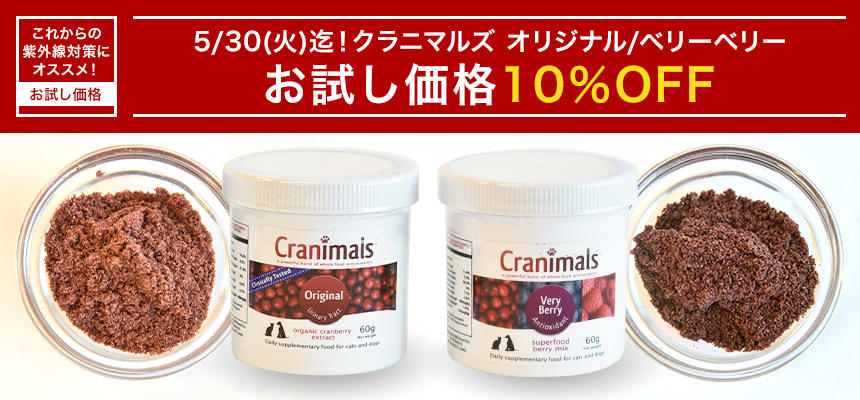 濃縮ジュースの粉末のような高品質サプリメント「クラニマルズ ベリーベリー」と「クラニマルズ オリジナル」を5月30日(火)13:59までの期間限定でお試し価格10%オフでご用意しました。
