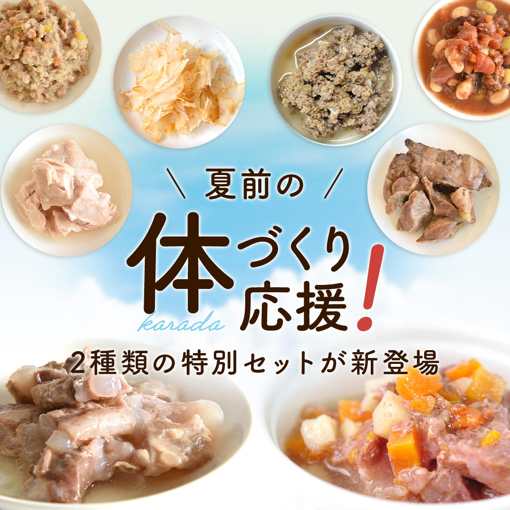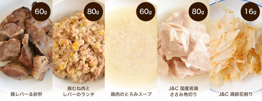 ゴロっと食べ応えのある「鶏レバー&砂肝」に総合栄養食の「鶏むね肉とレバーのランチ」、フードにからみやすい「鶏肉のとろみスープ」、食べやすいサイズにカットした「J&C 国産若鶏 ささみ角切り」、うまみが凝縮された「J&C 鶏節花削り」の5種類をセットにしました。