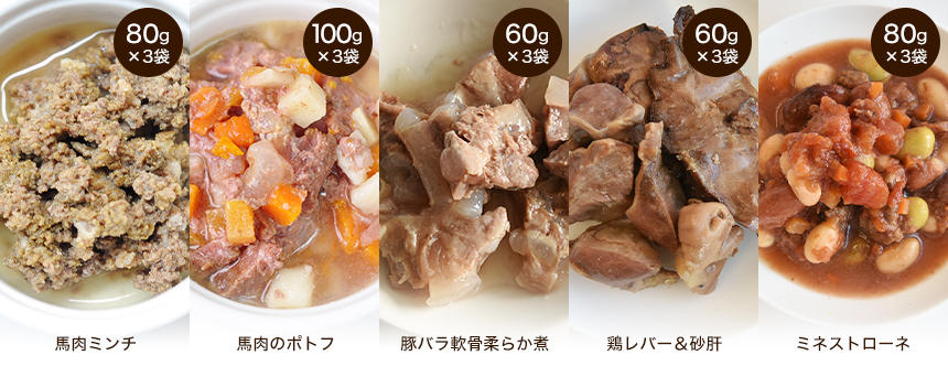 お肉の種類は馬肉・豚肉・鶏肉、3つのバラエティ。お肉大好きな犬たちもきっと満足すること間違いナシの5種各3袋の計15袋入りとなっています。