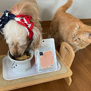 実は、犬と猫どちらも食べられるトッピングレトルトは結構多かったりします。シェリちゃんの家のように、犬と猫どちらもいるご家庭は、今回ご紹介したサーモンのとろみスープのようなトッピングレトルトなら、一緒に楽しめるはずです。