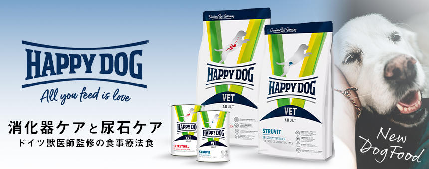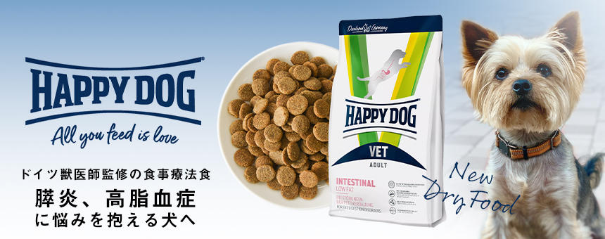 ドイツの獣医師が監修・開発した食事療法食「HAPPY DOG VET」シリーズに、膵炎、高脂血症に悩む犬のための療法食ドライフード「インテスティナル/ローファット (消化器ケア/低脂肪)」が新登場となりました。