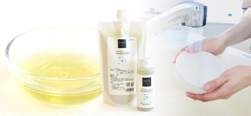POCHIの食器用洗剤「ヌメキュット」なら、頑固な食器のあのヌルヌルをすっきり落とします。
