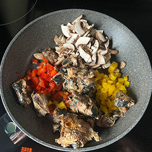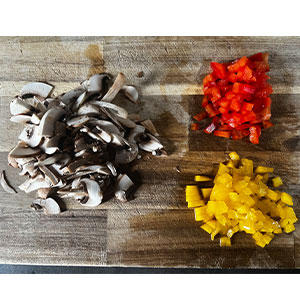 1.マッシュルームは水で濡らしたキッチンペーパーで優しく全体の汚れを落とす。半分にきり、薄切りしておく。パプリカ(赤・黄)は5mm幅にダイスカットしておく。