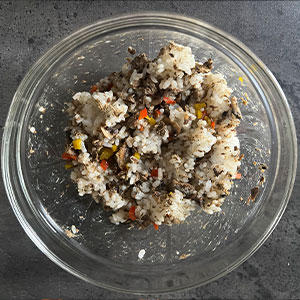 4.ボウルに白飯を入れ、3を60g加えて混ぜる。(※残りは冷蔵保存推奨)