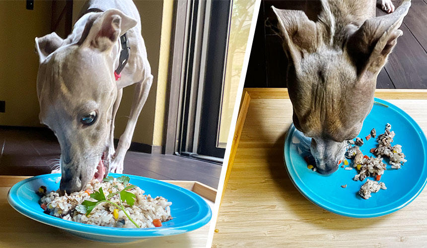 まずは食べ応えのあるトッピングしたイワシをパクリ。続いてごはんももぐもぐ。夢中になって食べてくれました。気温や湿度が高いと疲れやすいのに、食欲がなくなりやすくなるので、しっかり完食してくれてよかった。栄養もしっかり摂れて今日も元気いっぱいです。