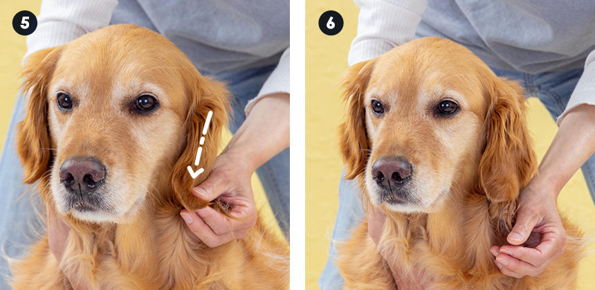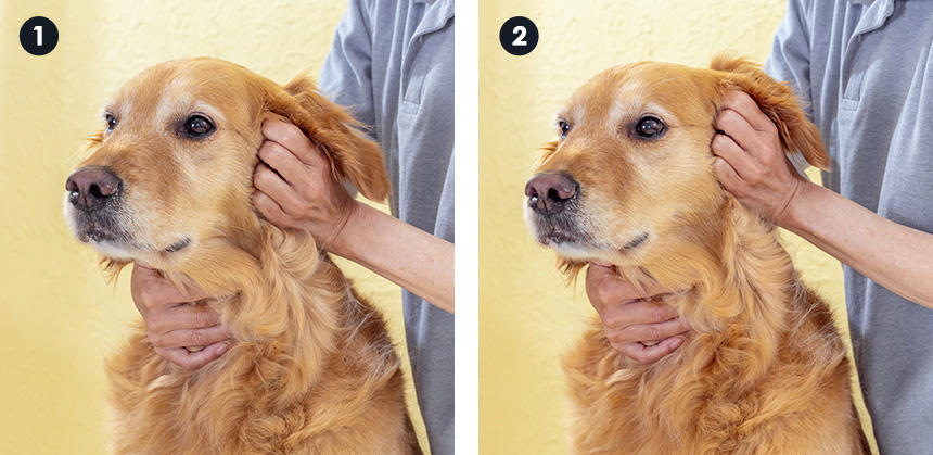 5)手の指で犬の耳の根元付近を挟み、耳全体の皮膚の上をゆっくり滑らせるようにして指をスライドしていきます。花びらを扱うような、やさしい力でスライドを。