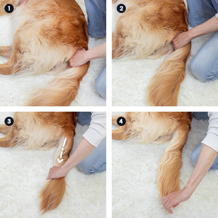 2)飼い主さんの手でしっぽを握ったまま、一呼吸おいてください。しっぽはぎゅっと握らず、軽くつかむ程度がちょうどよい力加減です。