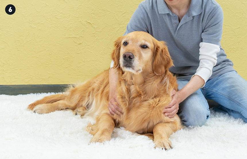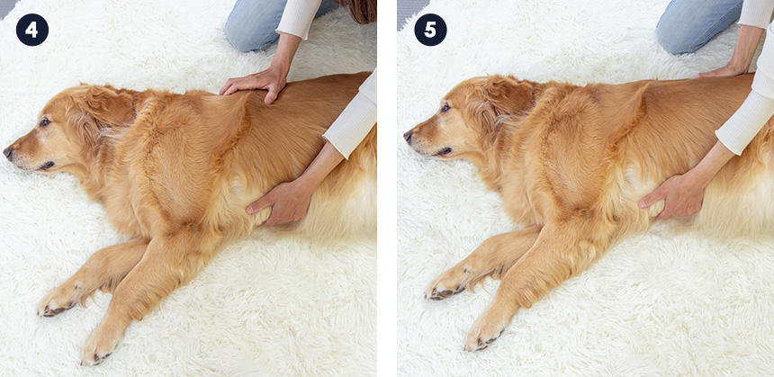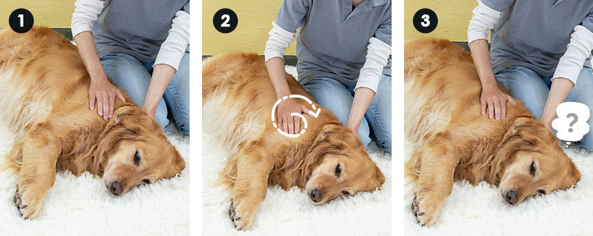 3)ひとつの円を描き切ったら、飼い主さんは手の動きを少しだけ止めてください。「え?なに?」と、大きな犬に、自分の身体に起こったことに気づかせる時間を与えるのが重要だからです。