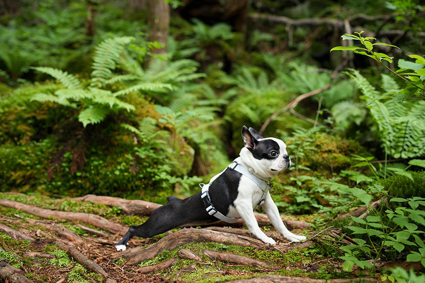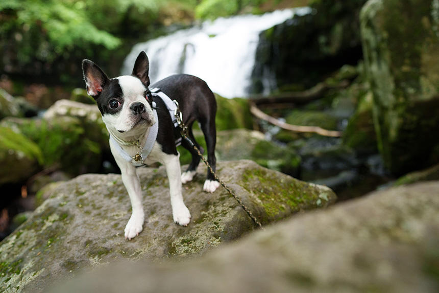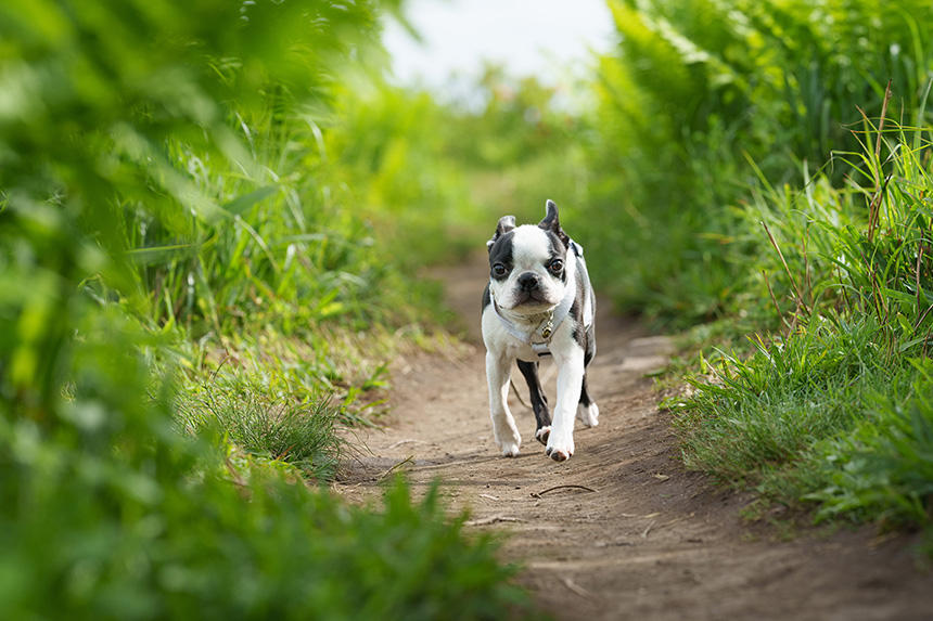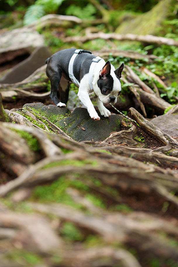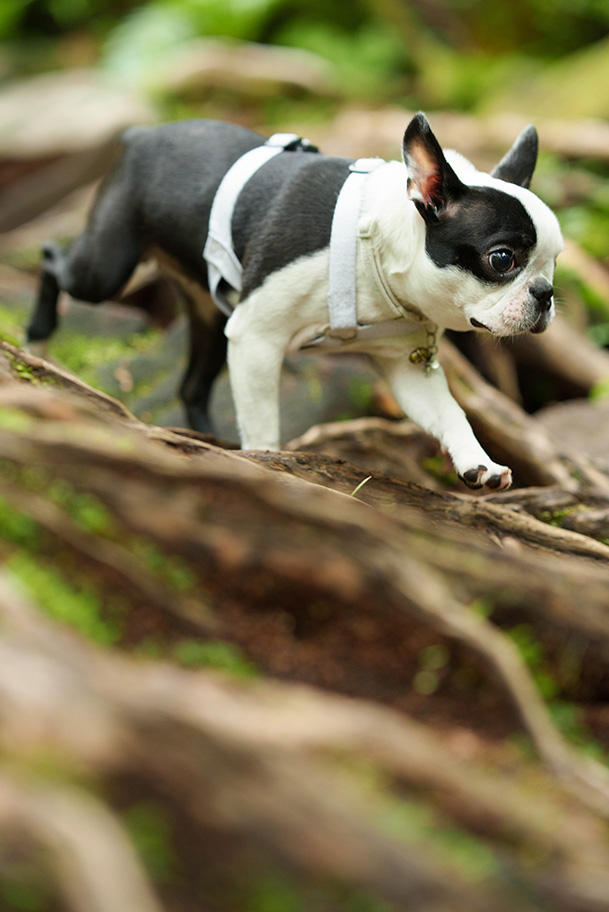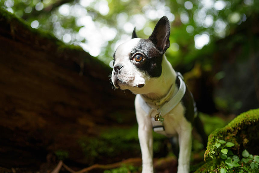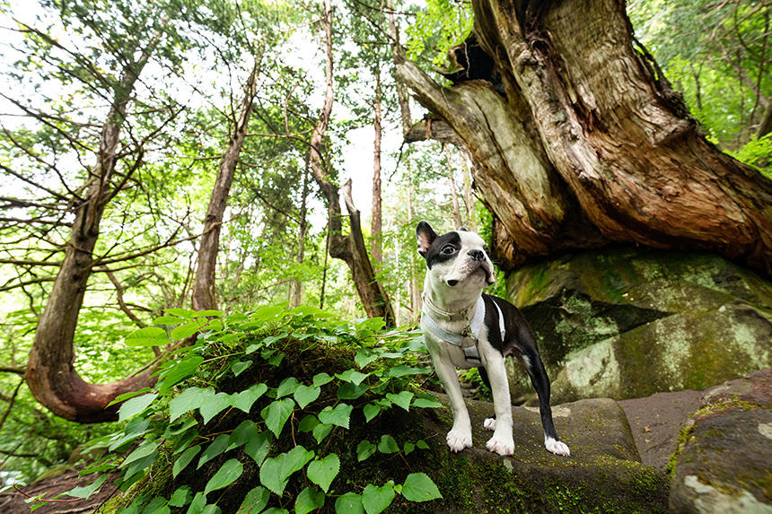 犬は、とても好奇心旺盛な動物です。特に子犬は、見るもの嗅ぐもの聞くもの全てが珍しく、あっちへトコトコ、こっちへトコトコ、興味のおもむくままに動き回ります。今回は、そんなボストン・テリアのtoco(トコ)ちゃんと、山深い原生林を散策しました。さて、どんな冒険が待っていることでしょう。