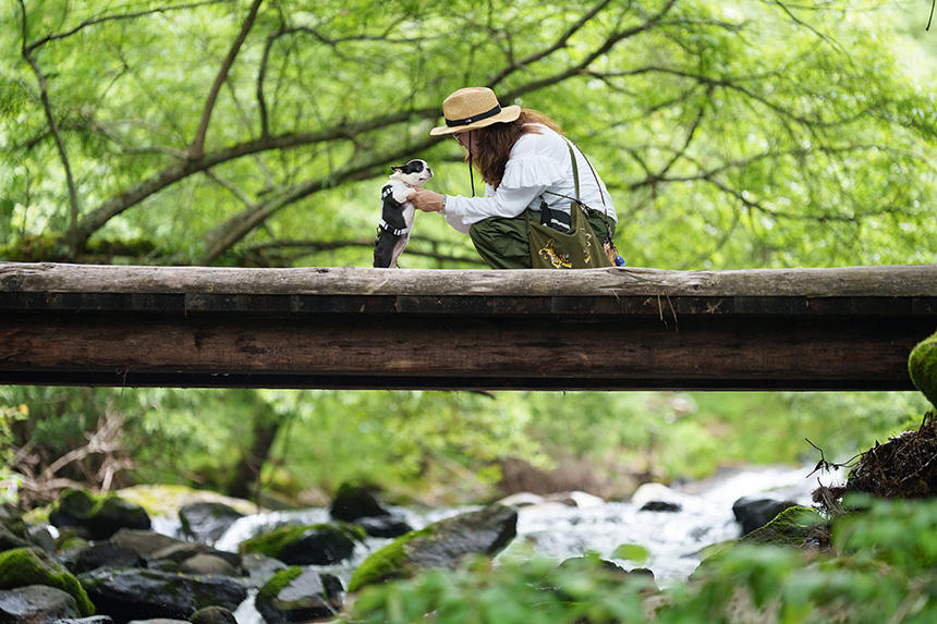 山の中は涼しくて、とっても気持ちがいいね。「おねえちゃんも来ればよかったのに」。トコちゃんは、同じボストン・テリアの先住犬と一緒に暮らしています。でも、今回、おねえちゃんは体調を崩してお留守番。だから、トコちゃんは、一人で未知の領域に足を踏み込むのも、今日が初めてなのです。