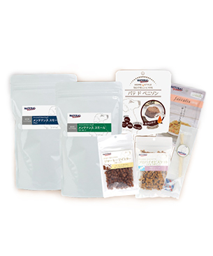 毎日のごはんの主食となるドライフードに、トッピングにつかいやすいウェットフードやパウダーフード、トレーニングやコミュニケーションにぴったりなおやつの組み合わせをご紹介。