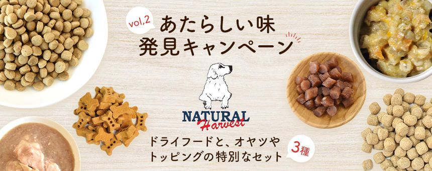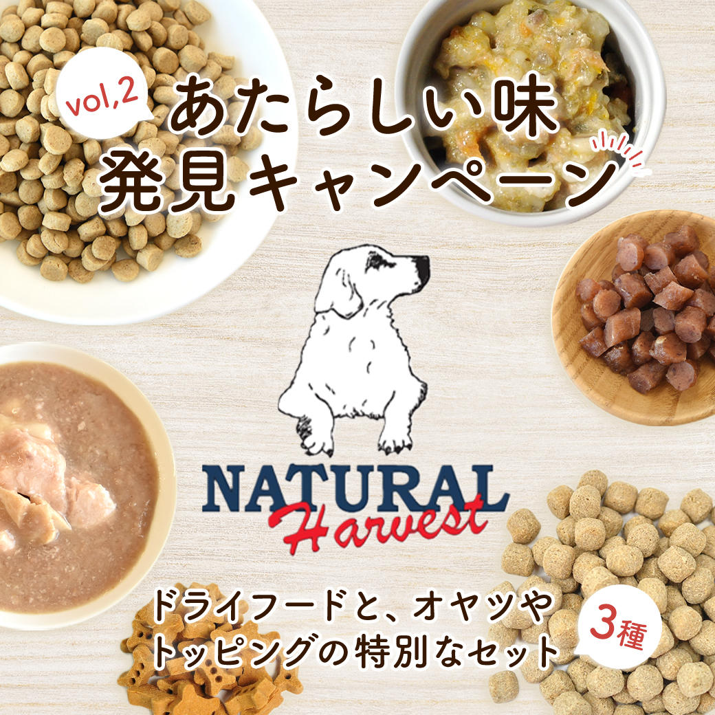メインフードにオヤツ、トッピングにサプリメントまで、100を超える豊富なラインナップのナチュラルハーベストより、 「あたらしい味発見キャンペーン第2弾」として、3種のセット品をご紹介。