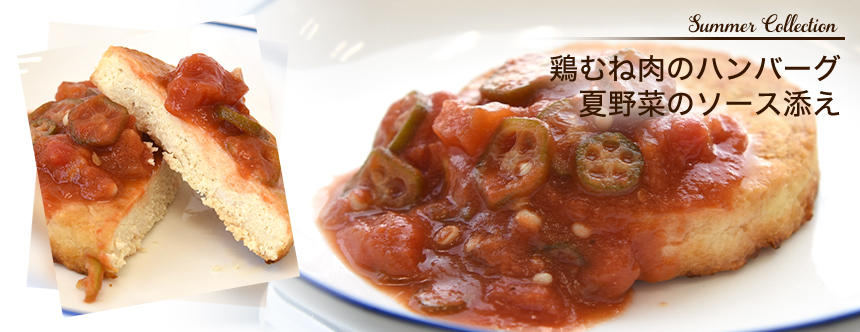 鶏むね肉を使ったハンバーグと彩り夏野菜ソースでさっぱり仕上げました。
