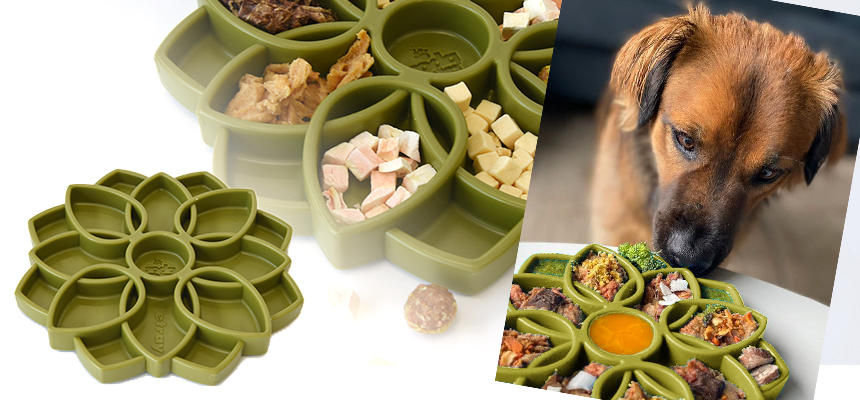 落ち着いたカーキカラーの「マンダラトレイフィーダー グリーン」は、幾何学模様のようなデザインと早食い防止を組み合わせたソーダパップのフードボウル。