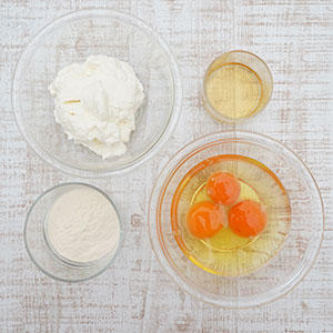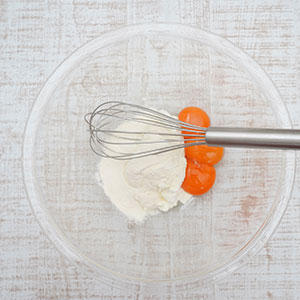 1.ボウルに黄身、水切りヨーグルト、薄力粉、はちみつを入れ、混ぜる。