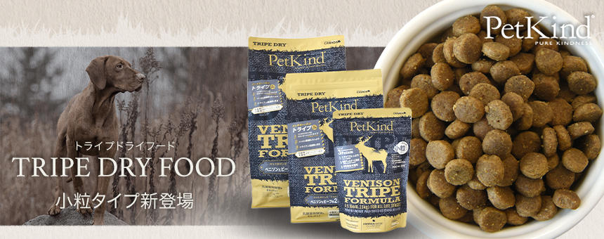 TRIPE DRY(トライプドライ)は、第一主原料にトライプを使用し、高い嗜好性はそのままで、トライプの独特な臭いを抑えた画期的なドライフードです。