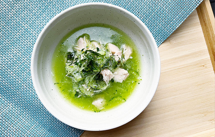 今回のレシピのポイントは、チキンのスープ煮レトルトを事前に冷やしておくこと。冷蔵庫である程度冷やしておけば、体のクールダウンにピッタリのメニューになりますよ。