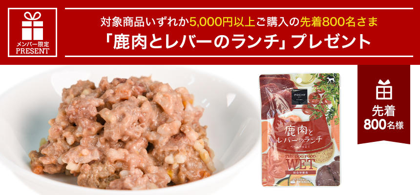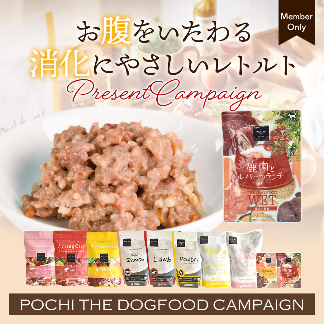今回お腹をいたわる消化にやさしいレトルトとして、「POCHI ザ・ドッグフード ウェット 鹿肉とレバーのランチ」を先着プレゼントとしてご用意。