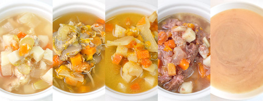 免疫の健康維持に嬉しい栄養素を含むキノコ類である椎茸、エノキが入った「野菜とキノコのたまごスープ」、EPA/DHA、アスタキサンチンを豊富に含む鮭を使った「サーモンのとろみスープ」、緑黄色野菜の中でも栄養たっぷりでβ‐カロテンや食物繊維が豊富なニンジンをたっぷり使用した「5種の野菜と鶏肉のスープ」「馬肉のポトフ」「根菜と豆乳の和風ポタージュ」。 秋に旬を迎えるキノコや鮭、ニンジンなどの根菜類からレトルト計5種をセレクトしました。
