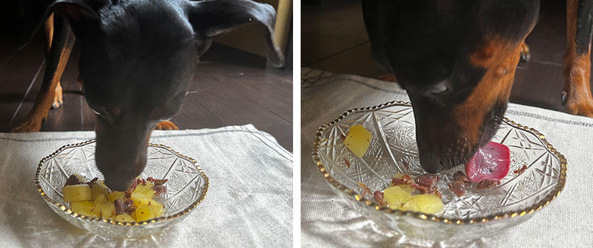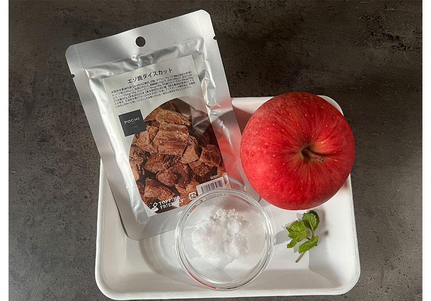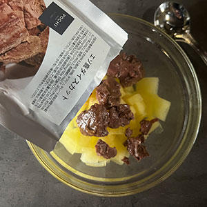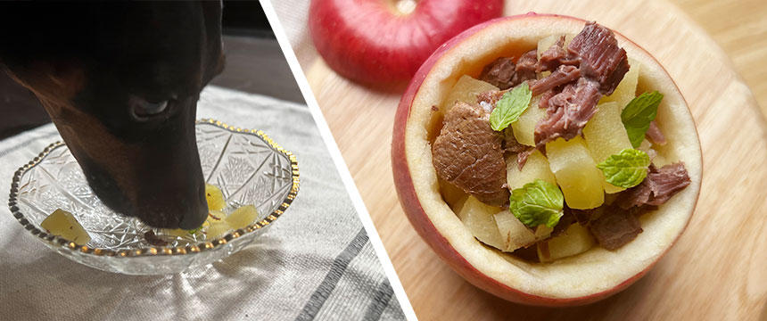 野菜も果物も好きなうちの子。りんごの器ごと食べてしまいそうなので、お皿に取り分けていただきます。加熱したりんごは甘くて柔らかい!エゾ鹿との食べ合わせも気に入ったようで、バクバク食べていました。もっとほしいなとおねだり顔でしっかり完食。また作ってあげるね。
