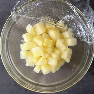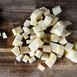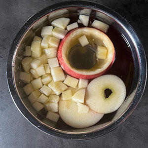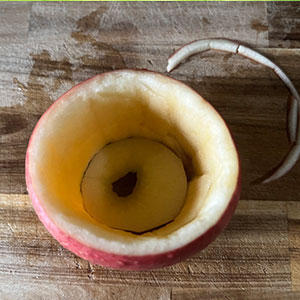 2.くり抜いたりんごの中身を食べやすい大きさにダイスカットする。(芯の部分は使いません)