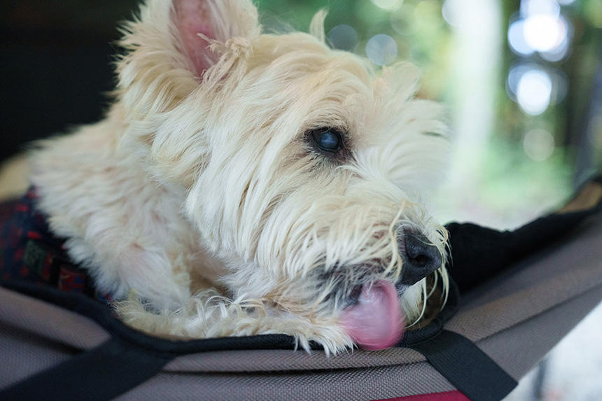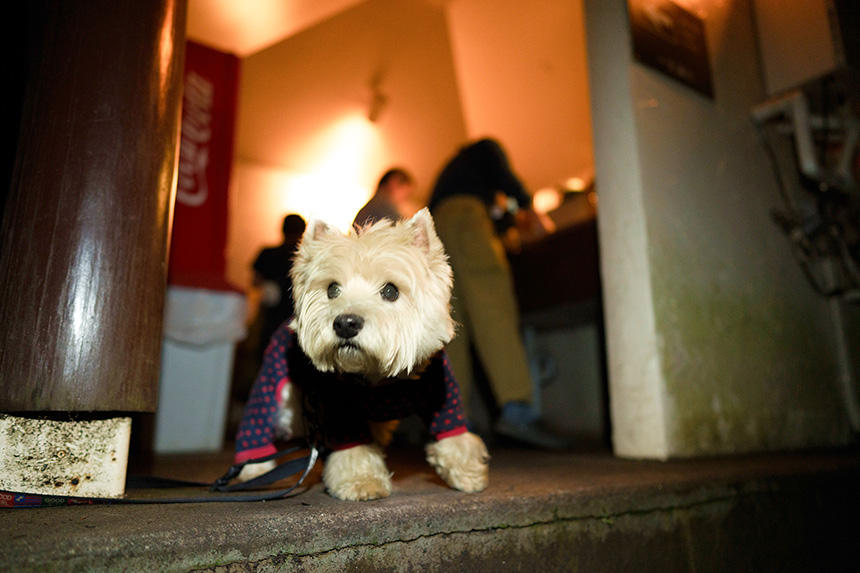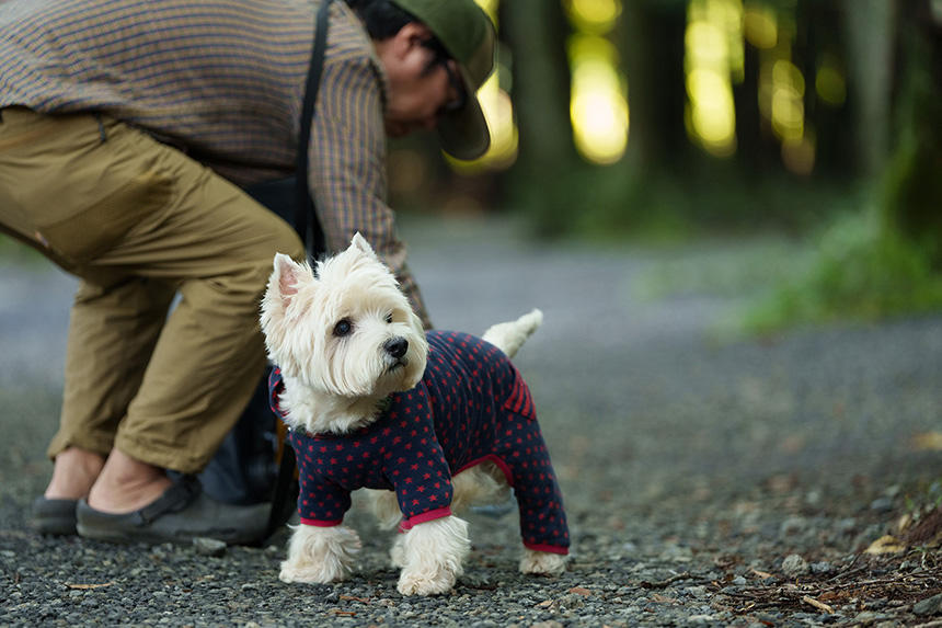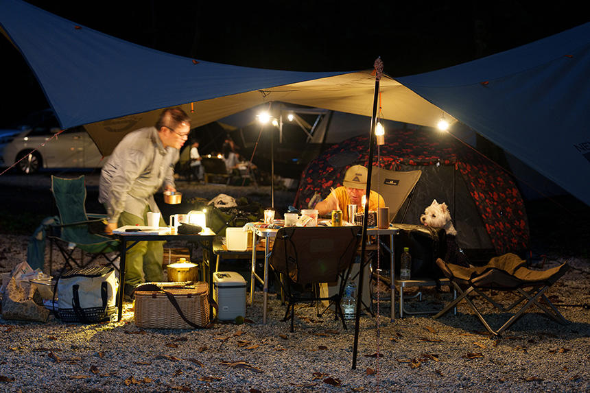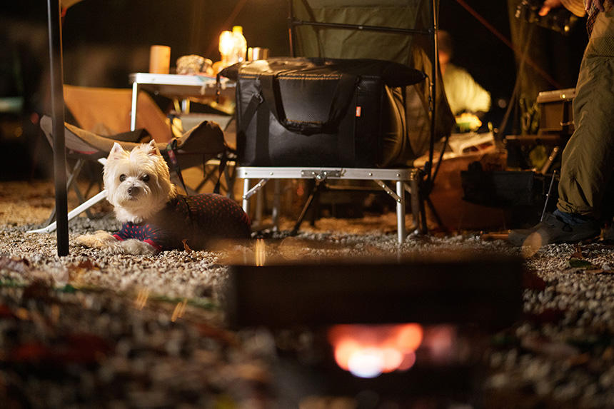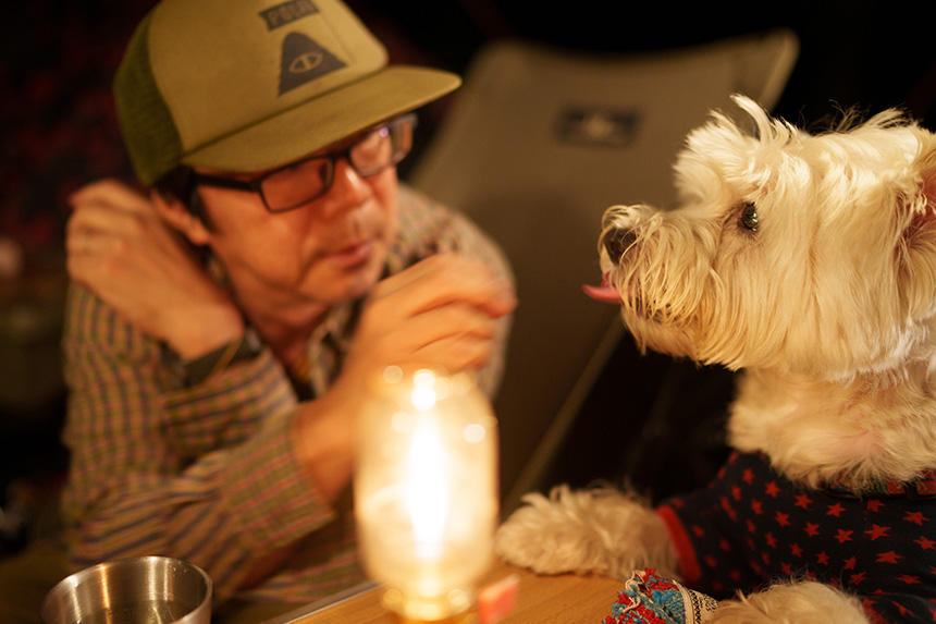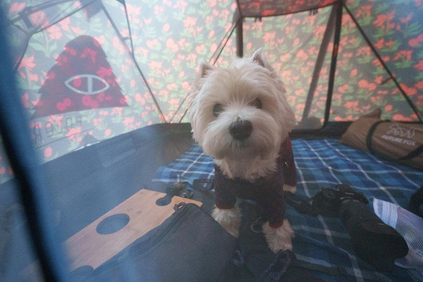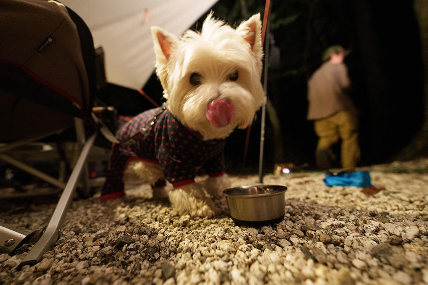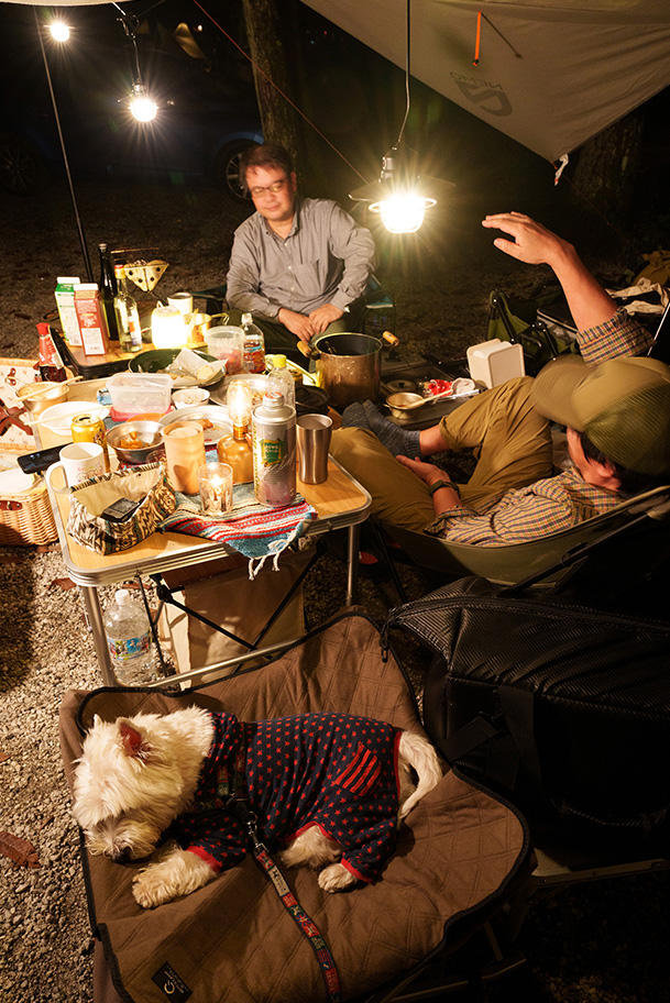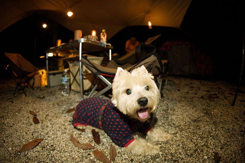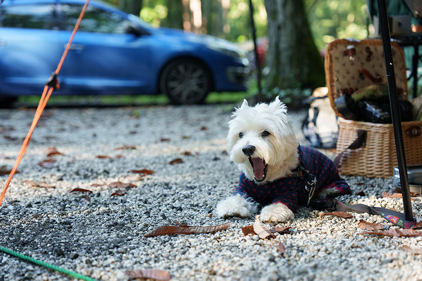 そんな折に、アウトドア系書籍のための撮影依頼があった。事前にちゃんと最近のキャンプ事情を経験しておかなければ、良い写真は撮れないだろう。そこで、毎週のように犬連れでキャンプをしている友人にお願いして、同行させてもらうことにした。ようやく残暑がやわらいできた9月の土曜日に、富士山麓のキャンプ場に1泊。参加者は、ウエスト・ハイランド・ホワイト・テリア(ウエスティ)の「デデ」、その飼主のHさん、車やアニメが大好きな食通のOさん、僕の「漢(おとこ)」4匹だ。