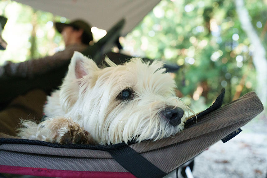 僕より一回り年上のHさんは、奥さんと「デデ」、その妹分のメスのウエスティ「にこ」と暮らしている。週末のキャンプには家族みんなで行くことが多いが、時にはデデと2人、「男だけの週末」を楽しむこともある。多頭飼いの場合、飼い主の愛情を独り占めする「一人っ子」の経験がある先住犬に対する気遣いが必要だ。普段はおしゃまな「にこ」に押され気味な、おっとり系のデデにとっては、パパと過ごす「漢の時間」は良い息抜きになっていることだろう。