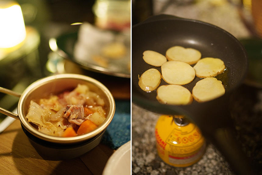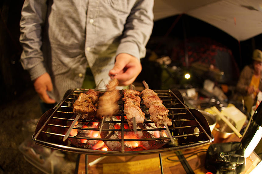 日没直前に遅れてキャンプサイトに着くと、ありがたいことに、既にHさんとOさんの手でタープの下に食卓や調理器具が設営されていて、晩餐が始まるところだった。それぞれが食材を持ち寄って、気ままに調理して分け合い、酒を飲む。登山や野宿旅の「野営」では、食事はできるだけ簡素に済ますが、こうした週末のレジャーキャンプでは、「メシ」と「酒」が主役だ。