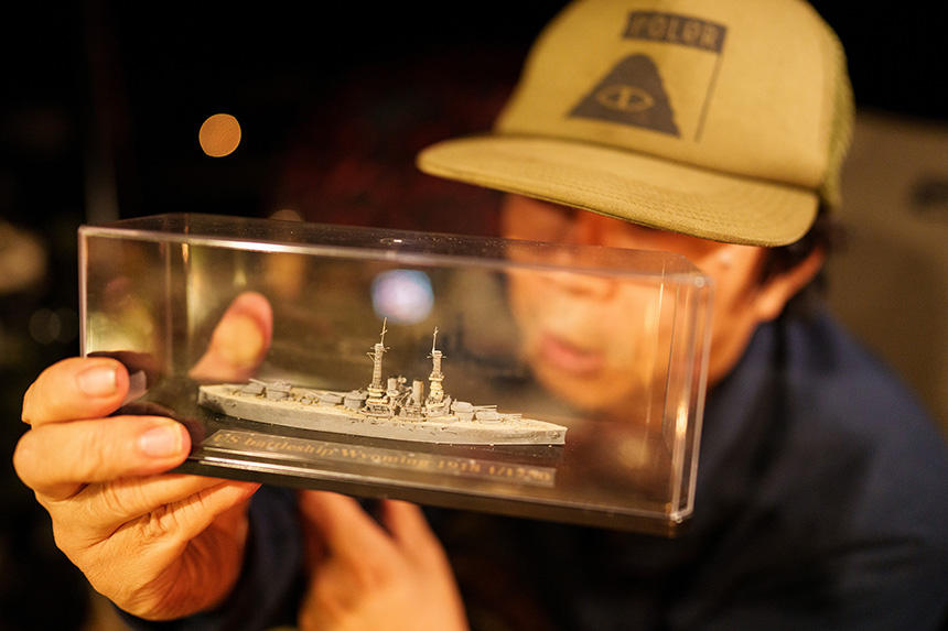 デデは自分のごはんを食べたら、夜風に吹かれてまたスヤスヤ。かわいい寝息を聞きながら、おじさんたちの趣味の話は続く。Oさんが最近作ったマニアックな艦船模型のお披露目なんかもあったりして、宴はますます心地よくヒートアップする。犬と出かけて一緒に何かをするのも楽しいけど、こうして無垢な存在がただそこにいてくれるだけで、「楽しい時間」が「至福の空間」へと昇華する。