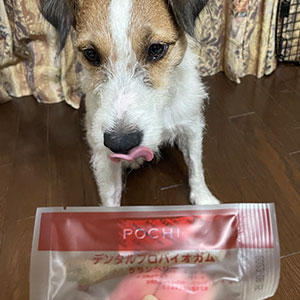 今回は、モニターメンバーみんなにPOCHIが発売している3種類のタイプの違うガム(POCHI デンタルプロバイオガム、POCHI プレミアムローハイドガム スキニーツイスト、POCHI ナチュラルローハイドガム)を試してもらい、お気に入りを選んでもらいました。Sunちゃんはどれが一番お気に入りかな?