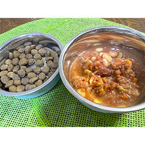 ポチのミネストローネも思わず飼い主のスープ皿によそってしまいそうになる美味しそうなビジュアルです。スープとフードでわけて準備してあげたら交互に食べていました。