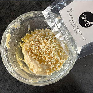 3.J&C プレミアムトリーツ フリーズドライ マイクロチーズ、オリーブオイルを加えひとまとめにする。