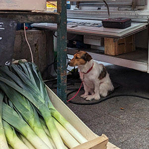 こちらは、フランス北部、セーヌ川沿いの都市、ルーアンの市場で見かけた犬。(手前はヨーロッパのネギことリーキです)