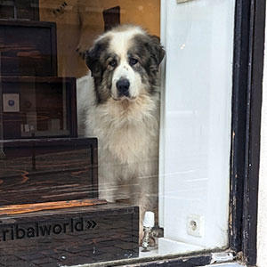 こちらはベルギーのブリュッセルのギャラリーの窓越しに通りを眺めていた犬。